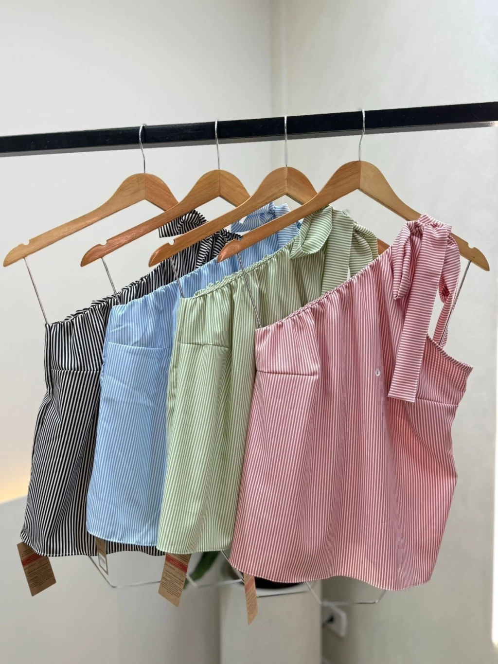 BLUSA REGATA PENÉLOPE♥. A Blusa Penélope é aquela regata estilosa que foge do óbvio! No modelo mula manca com elástico, ela traz um caimento leve e confortável, além de um detalhe que faz toda a diferença: uma faixa no ombro para amarração, que adiciona charme e personalidade ao look. Disponível em várias cores com listras e também em duas versões lindíssimas no clássico poá. Uma peça versátil, fresquinha e perfeita pra montar produções cheias de estilo!