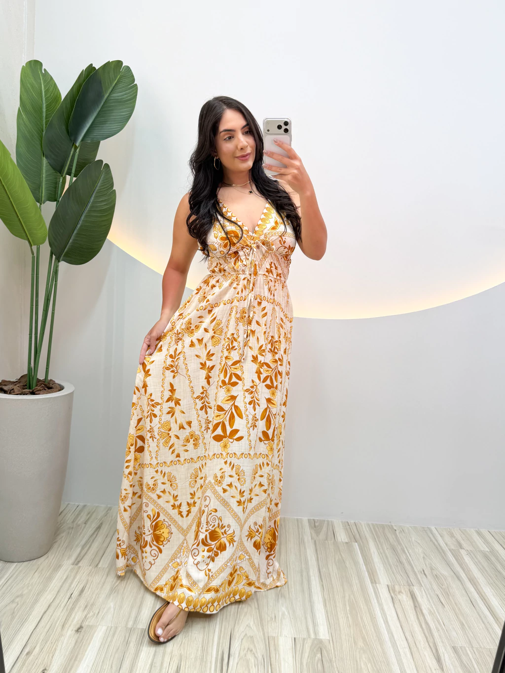 VESTIDO DANDARA♥. O Vestido Dandara é aquele clássico leve e encantador que nunca sai de moda. Com modelagem longa e estampada, ele traz um visual fresquinho e cheio de estilo. As alcinhas finas com regulagem garantem ajuste perfeito e conforto, enquanto o decote em V valoriza o colo de forma delicada.