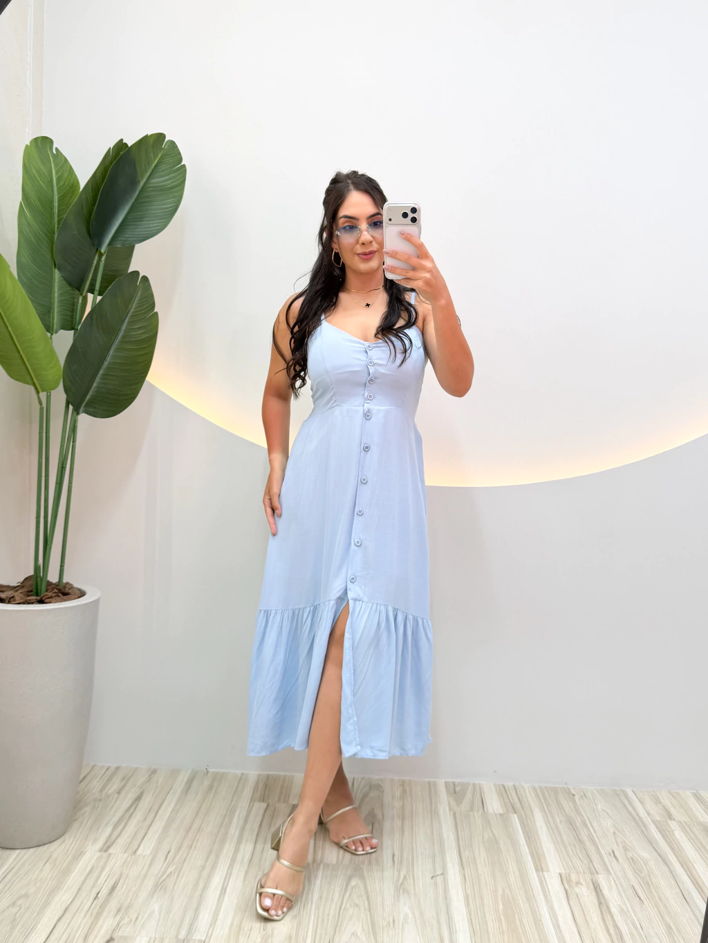 O modelo conta com bojo embutido, garantindo conforto e sustentação, além de alcinhas finas com regulagem, que permitem um ajuste perfeito ao corpo. O lastex nas costas proporciona flexibilidade e se adapta ao corpo, enquanto os botões frontais adicionam um charme romântico e moderno ao visual, completando com uma fenda.